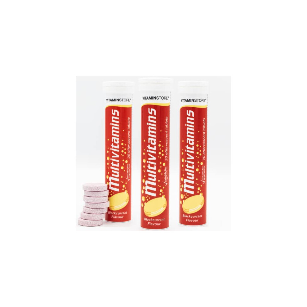 Effervescent Multivitamins - 3 Packs of 20 Blackcurrant Flavour Fizzy Dissolvable Tablets - Vitamins A, C, D, E, K, B1, B2, B6 B12, Folic Acid - 2