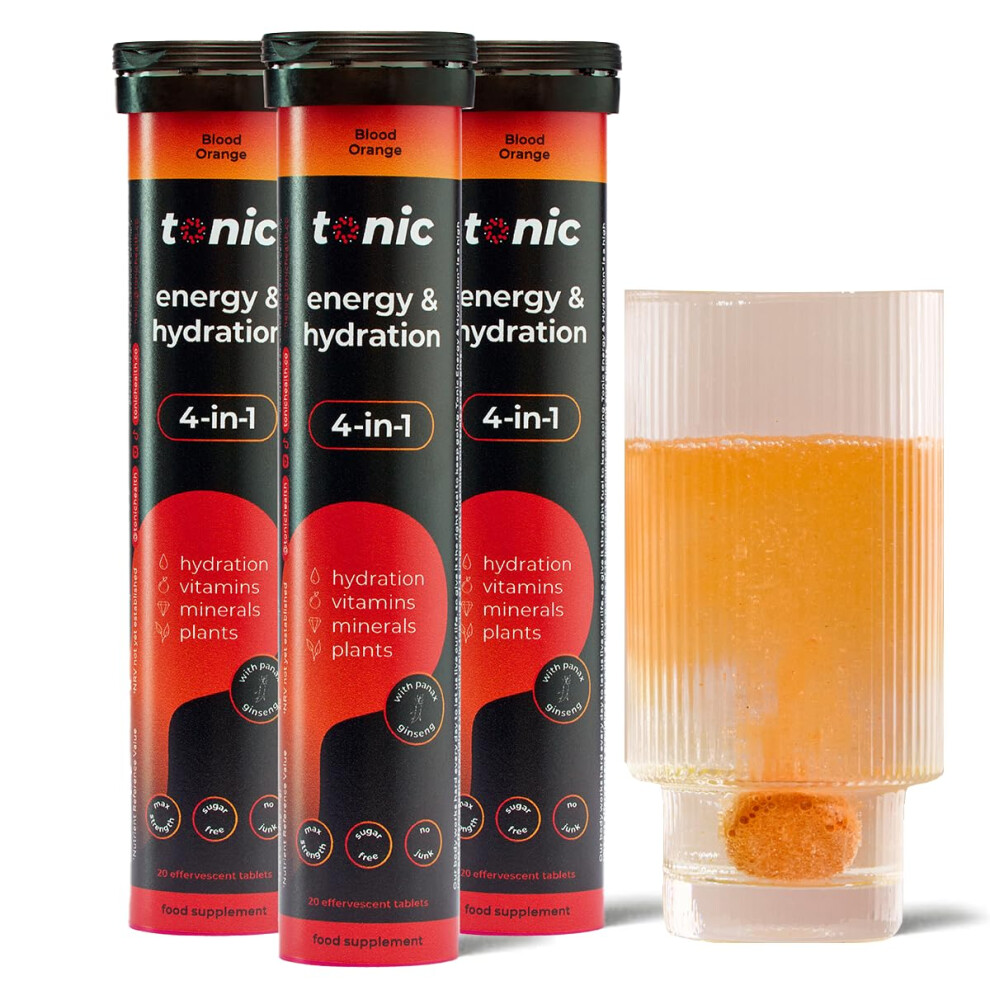 Tonic Health Energy and Hydration Tablets - 15 Vitamins, Minerals, Plants with Panax Ginseng, No Sugar Effervescent Multivitamins - Rehydration Electrolytes Tablets, Blood Orange 20 Count