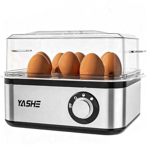 YASHE Rapid Egg Cooker, 8 Egg Capacity Stainless Steel Boiler Egg Maker for Soft, Medium, Hard Boiled Eggs, Poached with Auto Shut-Off & Buzzer, Includes Omelet Bowl & Measuring Cup, BPA Free