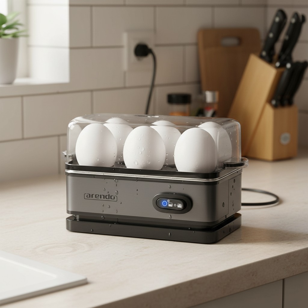 arendo - Electric Egg Boiler, Automatic Cooker with Warming Function, 6 Egg Capacity, Indication Light, for Perfect Soft and Hard Eggs,Water Measuring Cup and Egg Piercer, Stainless Steel, Cool grey