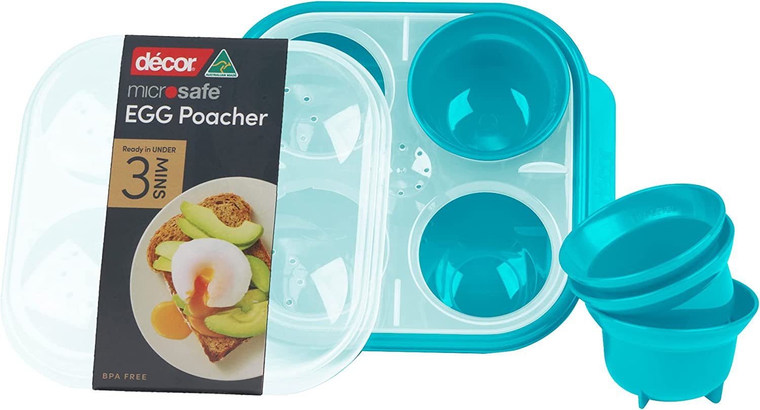 Décor Microsafe Microwave Steam Egg Poacher. Cooks 1-4 Eggs at Once in Under 3 Minutes. BPA Free and Fully Dishwasher and Freezer Safe. with Safety Hold Handles and steam Release Vents. Teal.