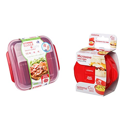 Décor Microwave Bacon Cooker | Splatter Proof Bacon Crisper Tray with Lid | BPA-Free Red & Sistema Microwave Egg Cooker Easy Eggs | Egg Poacher with Steam Release Vent | 270 ml | BPA-Free | Red