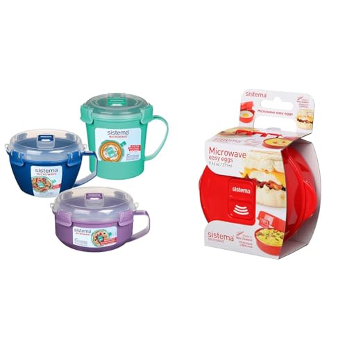 Sistema 3 Pack Soup, Porridge & Noodle Bowl to Go, Assorted Colours & Microwave Egg Cooker Easy Eggs | Egg Poacher with Steam Release Vent | 270 ml | BPA-Free | Red