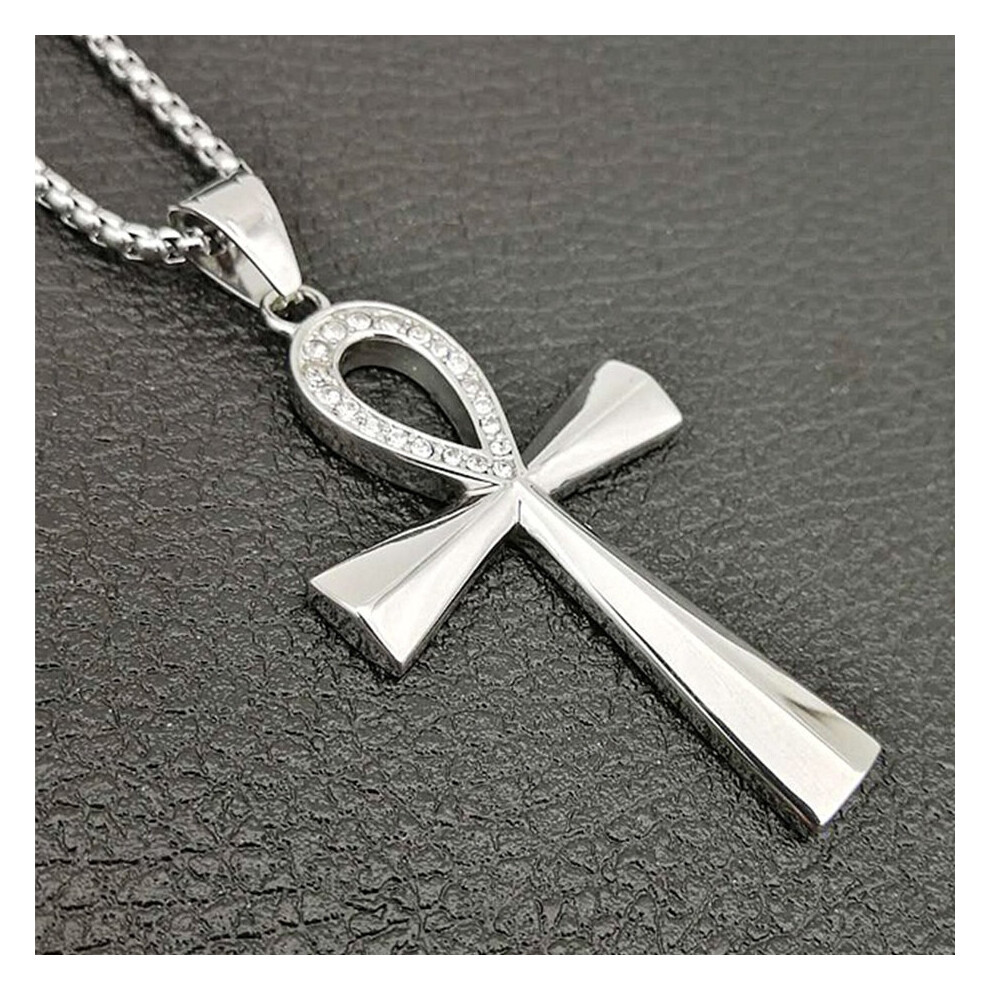 (Light Yellow Gold Color, 60cm) Egypt Iced Out Bling Ankh Cross Pendant Necklace For Women And Men Key of Life Stainless Steel Egyptian Jewelry