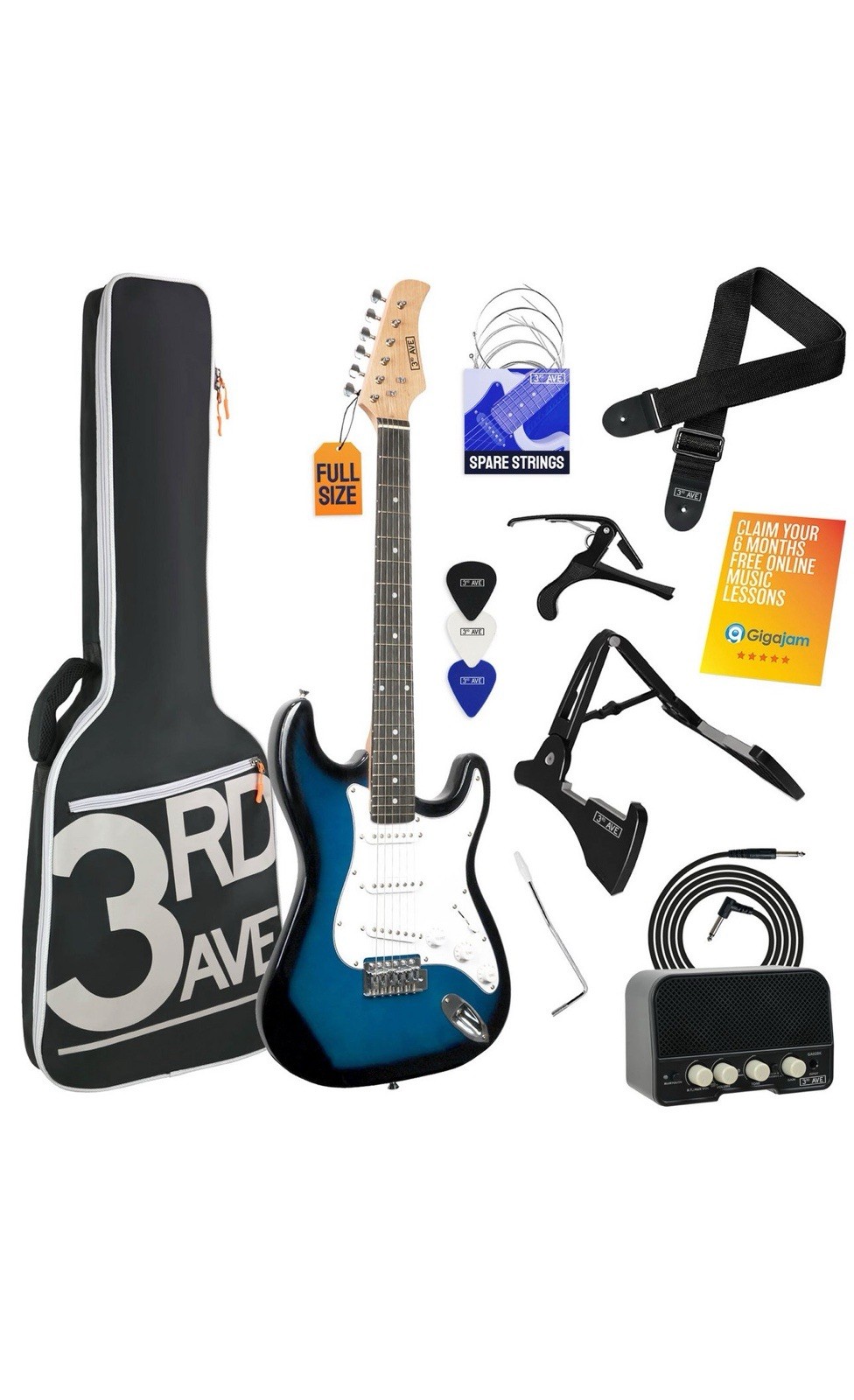 3rd Avenue Stateside Full Size 4/4 Electric Guitar Ultimate Kit with 5W Amp, Cable, Stand, Padded Gig Bag, Strap, Picks, FREE LESSONS – Delta Blue