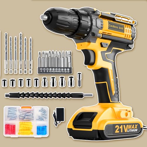Cordless Power Drill Set with LED Light Electric Combi Screwdriver Drill Set with 2-Speed, 45Nm 25+1 Torque Setting, 21V Li-ion 2X 1.5AH Battery&Charger,3/8" Keyless Chuck Driver Tool, 26PCS Bits Kit