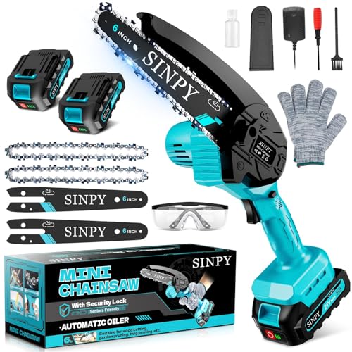 SINPY Mini Chainsaw Cordless 10000mAh 6 Inch [2025 Upgraded] Battery Electric Chain Saw Small Portable Chainsaws with Security Lock for Tree Trimmer/Garden Gifts for Women Men
