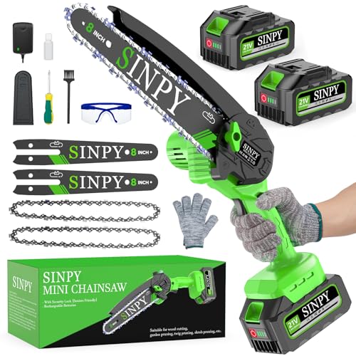 SINPY 8 Inch Mini Chainsaw Cordless with 2x5000mAh Electric Chain Saw with Auto Oiler/Safety Lock Powered Handheld Chainsaws for Tree Trimming Pruning