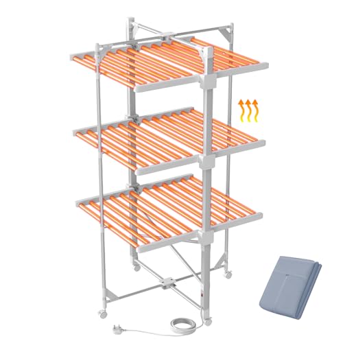 Electric 3 Tier Heated Clothes Airer with Cover, Foldable Electric Clothes Drying Rack Electric Clothes Horse with 36 Heated Rails for Quick Drying, 21M Drying Space, 300W