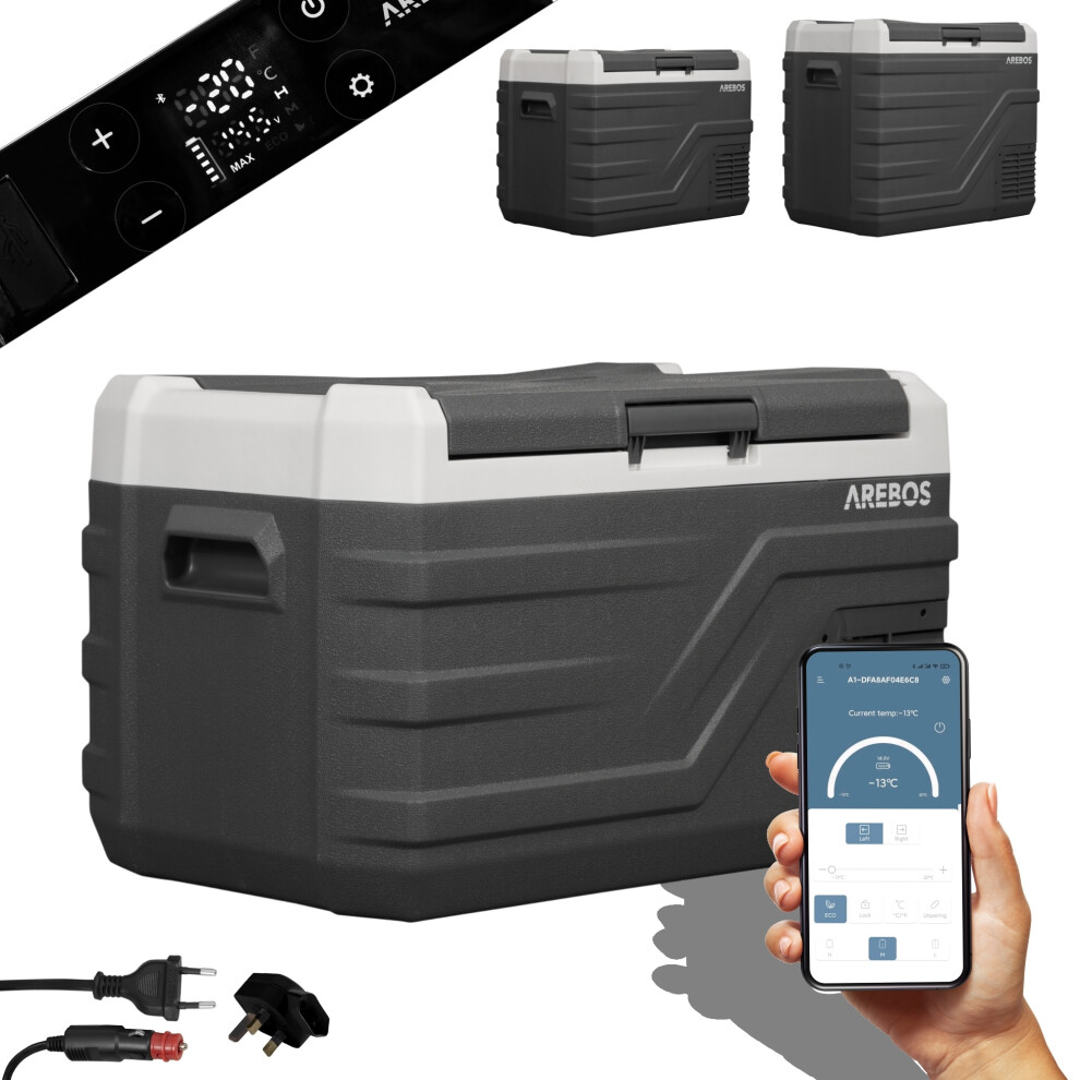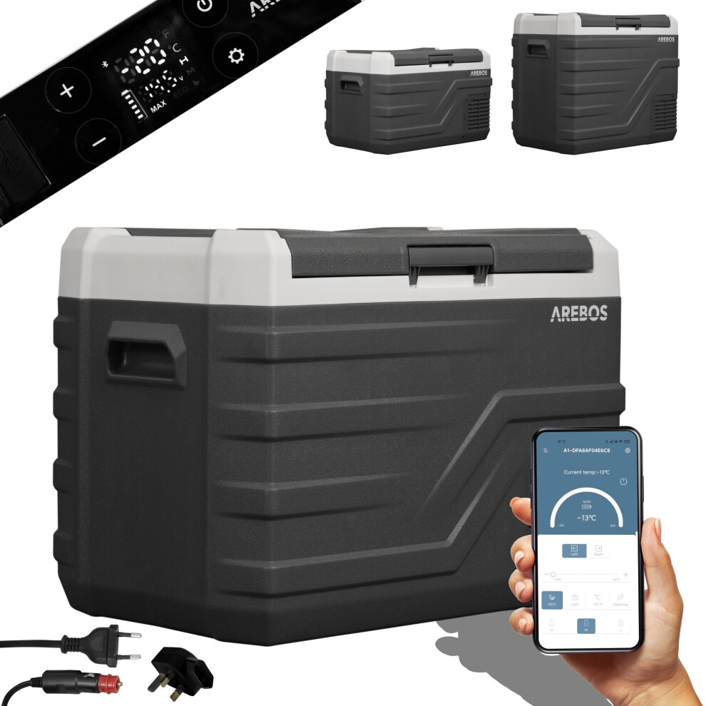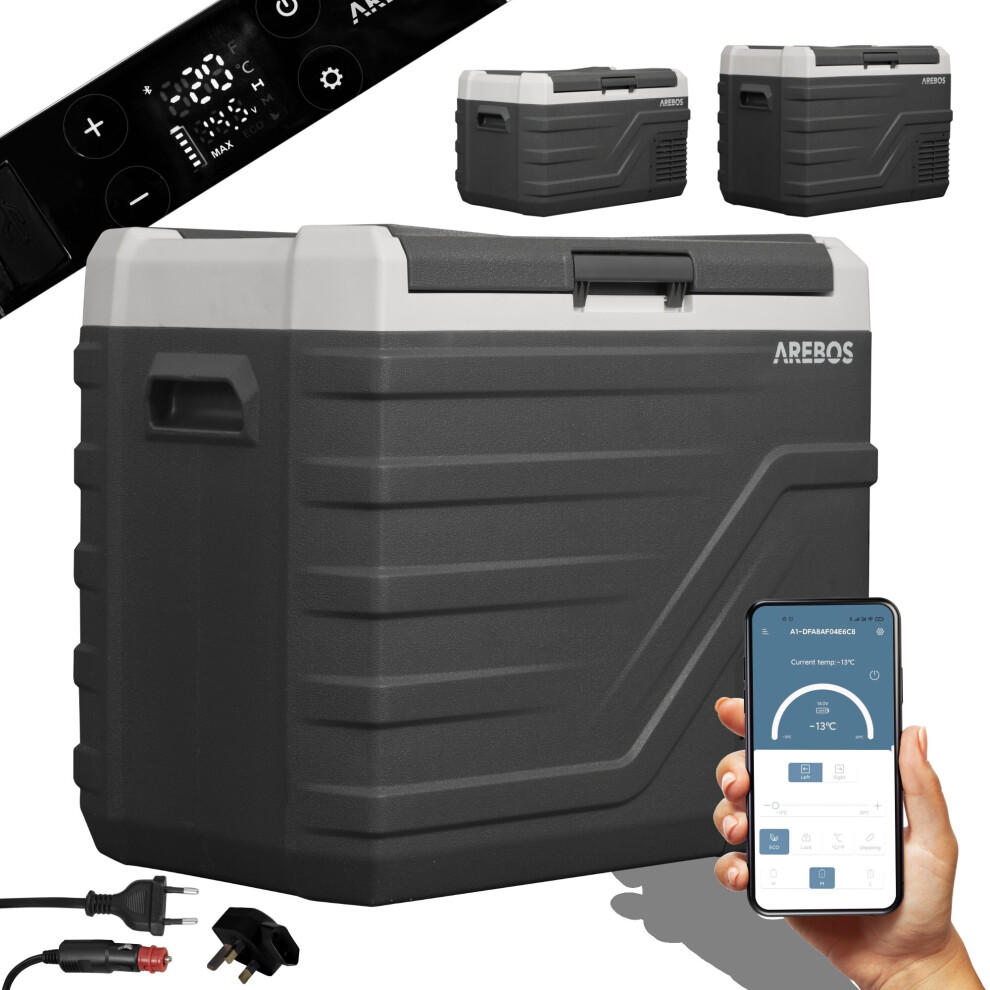 Arebos compressor cool box 43 liters | Electric freezer box with APP control for cooling, freezing and keeping warm | Refrigerator down to -20 °C | Car cool box with USB connection, 12/24 V 230V