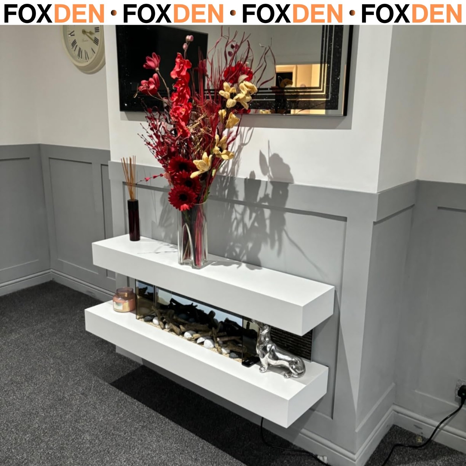 2025 TRUFLAME WHITE FLAT GLASS LED WALL MOUNTED ELECTRIC FIRE - PEBBLES AND LOGS!