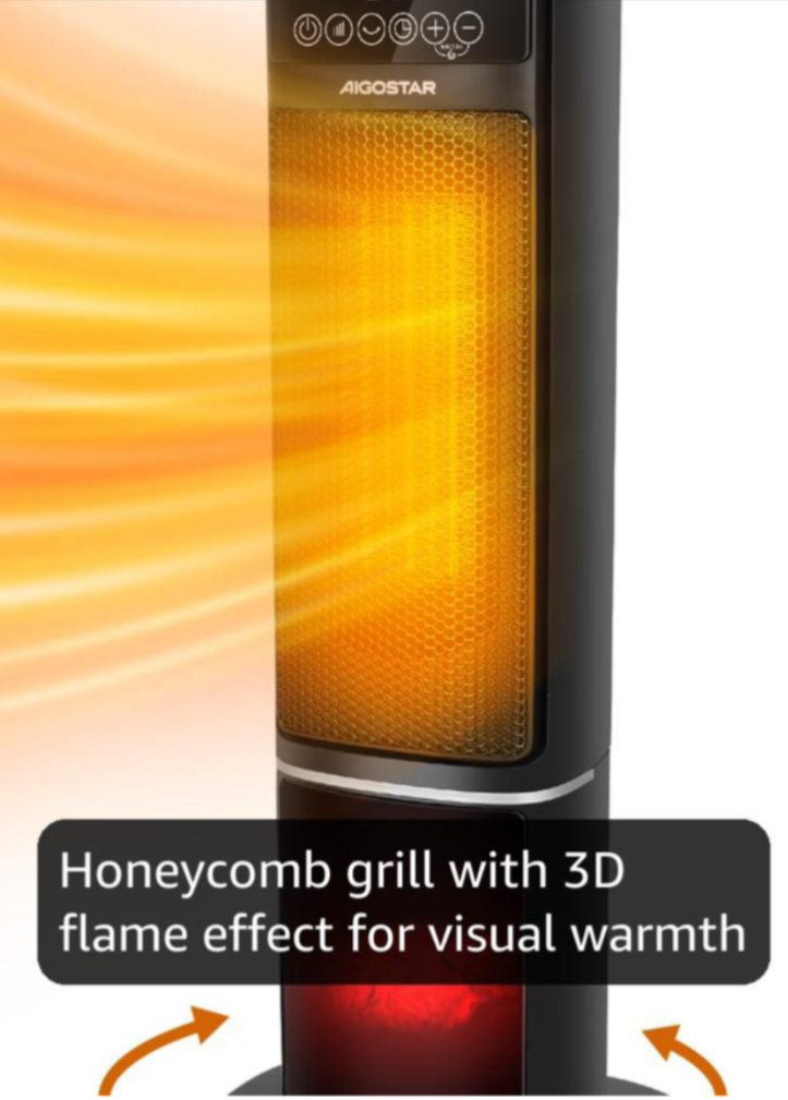 Aigostar Electric Fireplace Heater 2000W PTC, Flame Effect, Remote, Timer