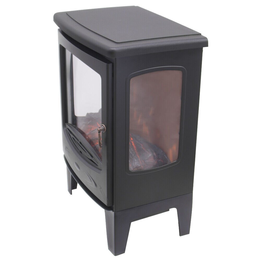 Black Freestanding Electric Stove Heater Fireplace Glass Door LED Flame Effect