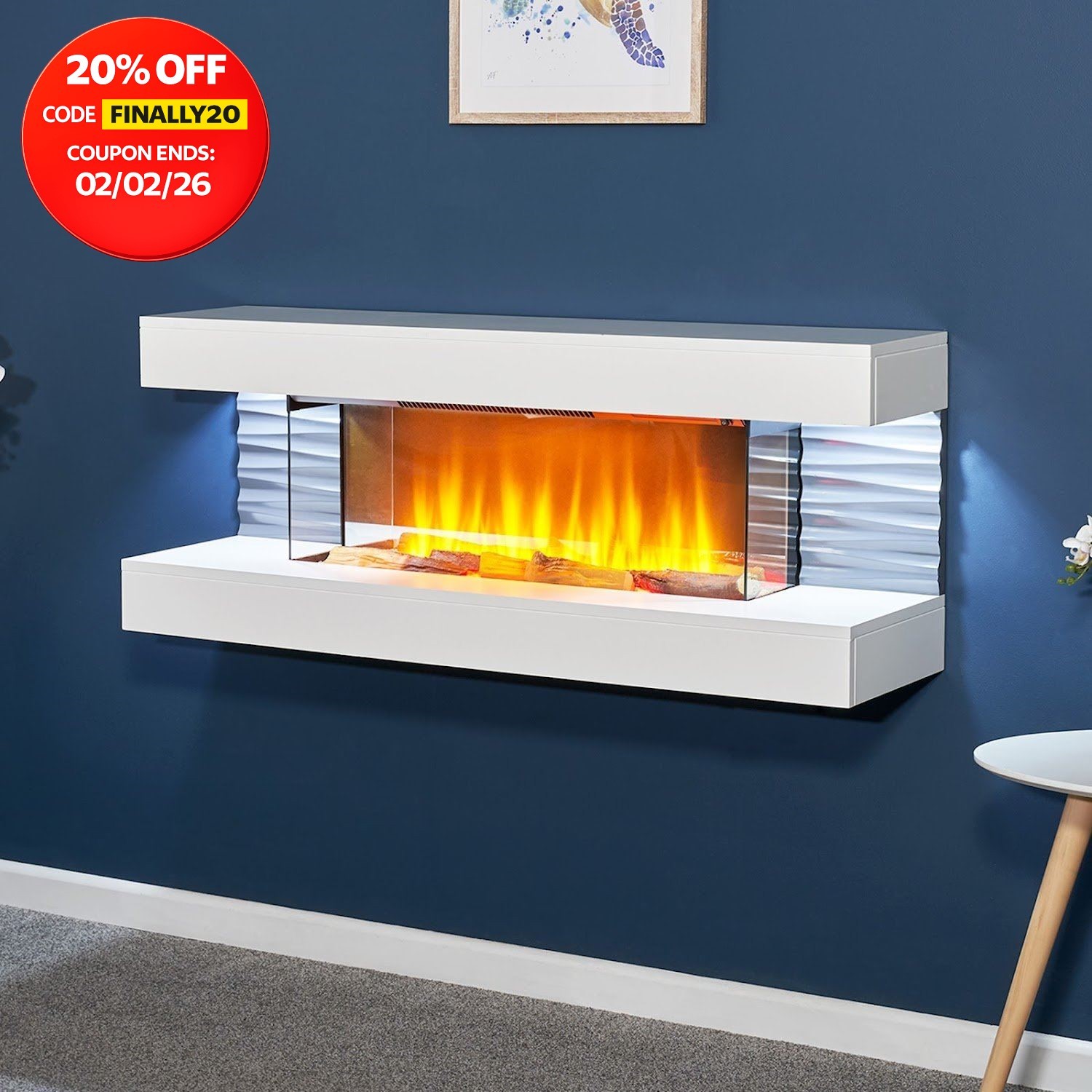Modern Glass Electric Fireplace Wall Mounted Heater Led Fire Flame Suite Mantel