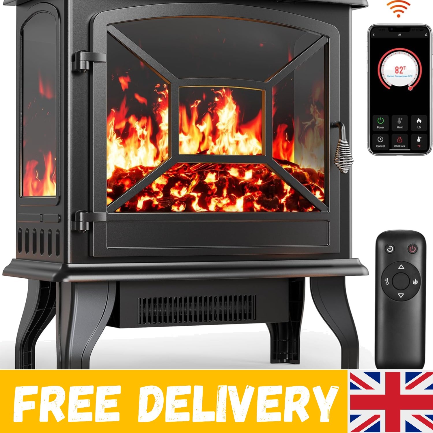 NETTA Electric Fireplace Stove Heater 1600-1800W with Fire Flame Effect, 2 Heat Settings, Adjustable Thermostat, Freestanding Portable Electric Log Wood Burner Effect - Black
