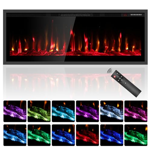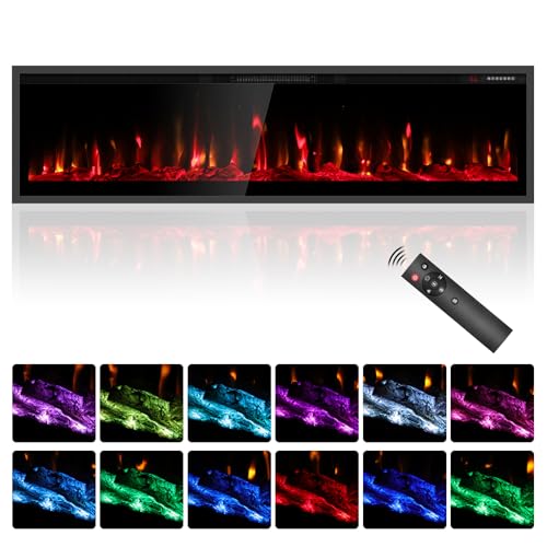 60'' Electric Fireplace Heater, Wall Mount/Recessed, 1500W & 750W Modes, 7 Flame & 12 Ember Colors, Remote & Touchscreen Control, 8H Timer, 40dB Ultra-Quiet, Cool-Touch Glass, UKCA/CE Certified