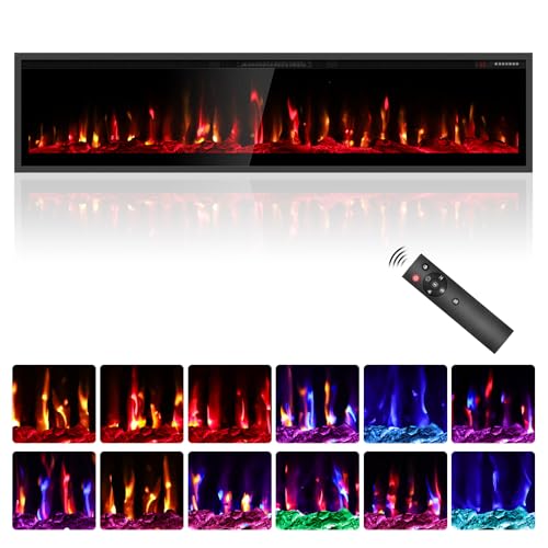 68'' Electric Fireplace Heater, Wall Mount/Recessed, 1500W & 750W Modes, 7 Flame & 12 Ember Colors, Remote & Touchscreen Control, 8H Timer, 40dB Ultra-Quiet, Cool-Touch Glass, UKCA/CE Certified
