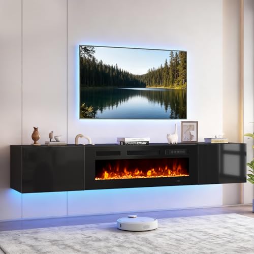 YISUFO 70" Floating Fireplace TV Stand, Black Entertainment Center & Black Electric Fireplace, High Gloss Doors, Floating TV Console Wall Mounted, Suitable for TVs up to 80 Inches