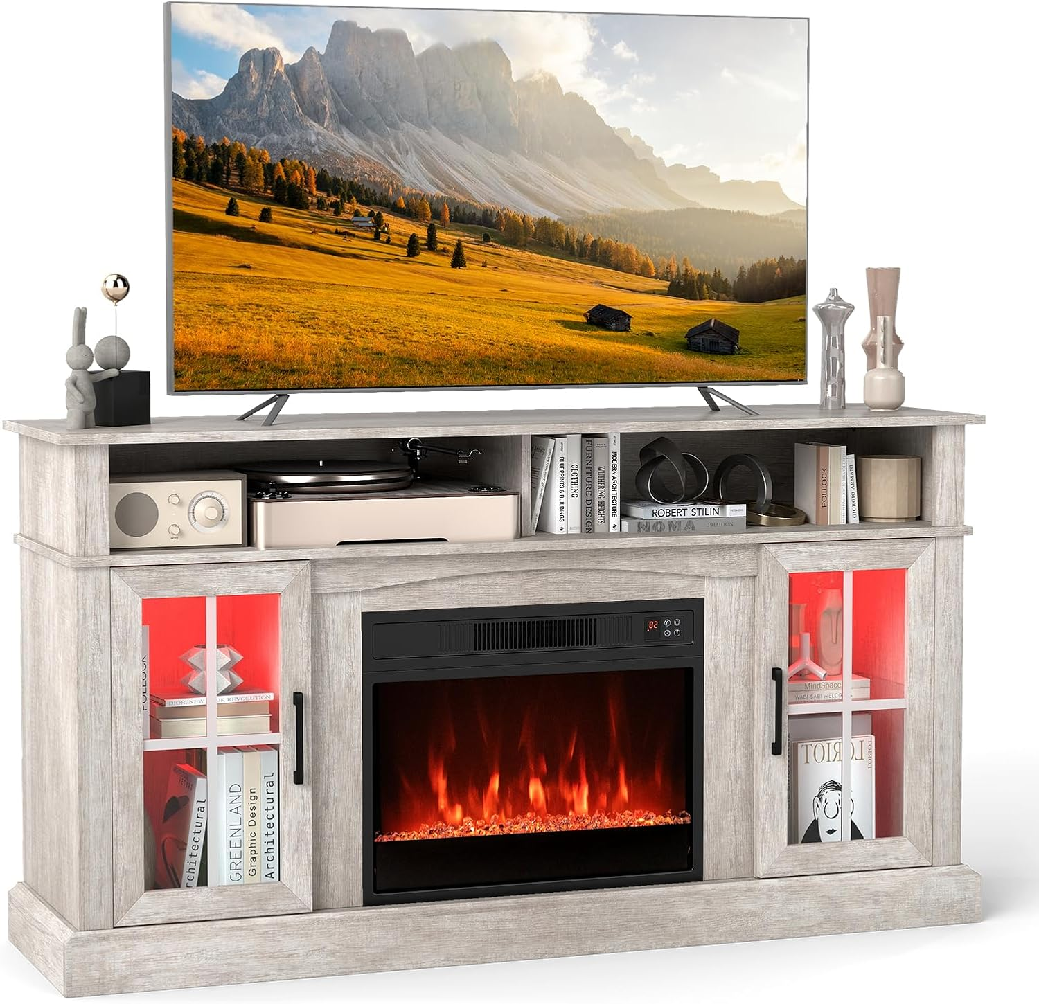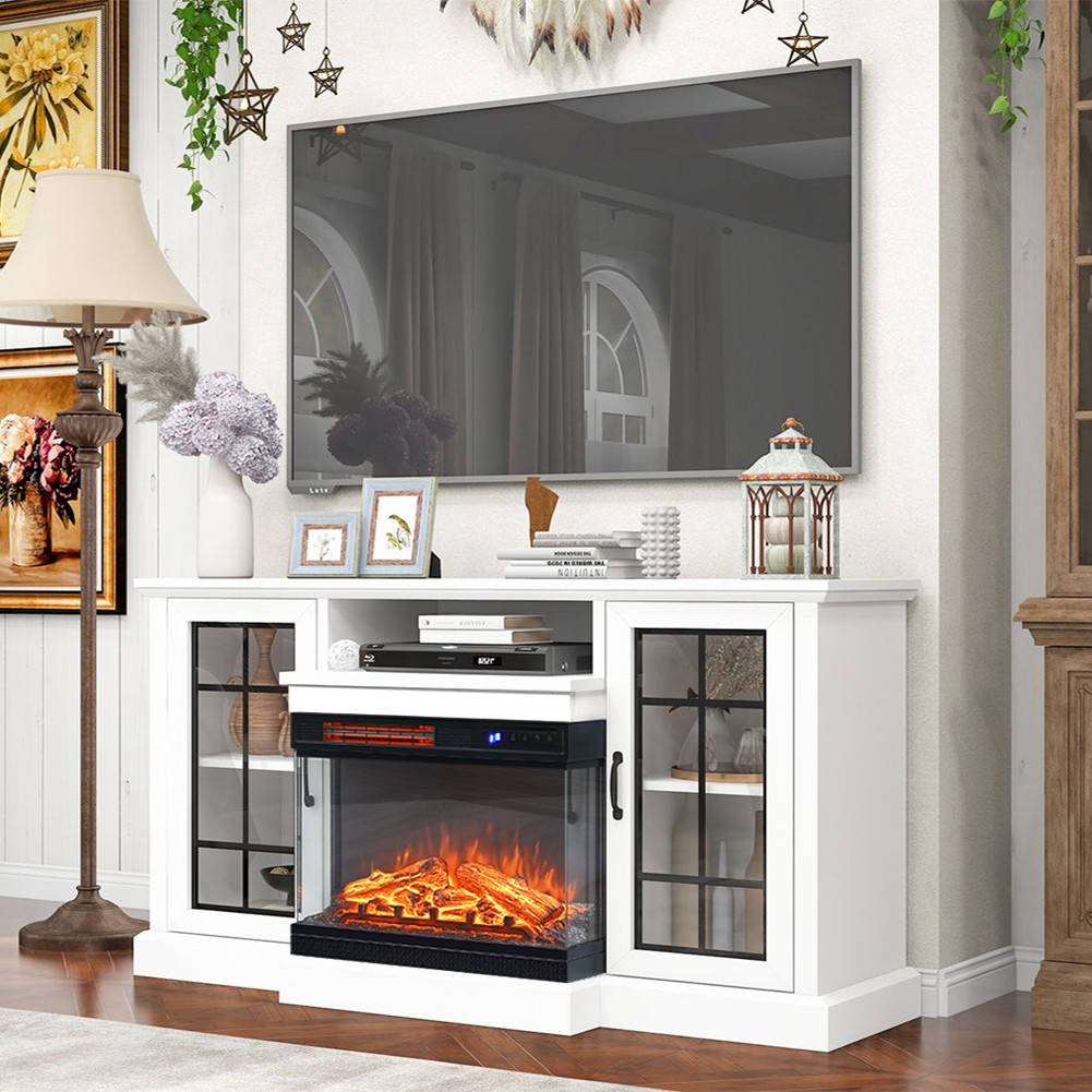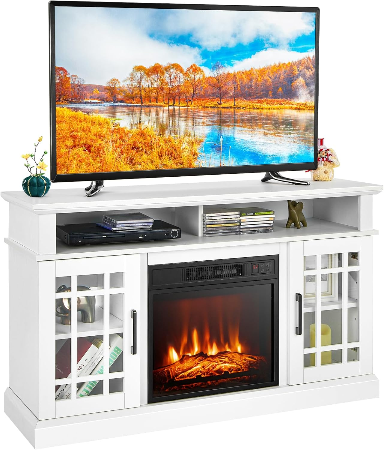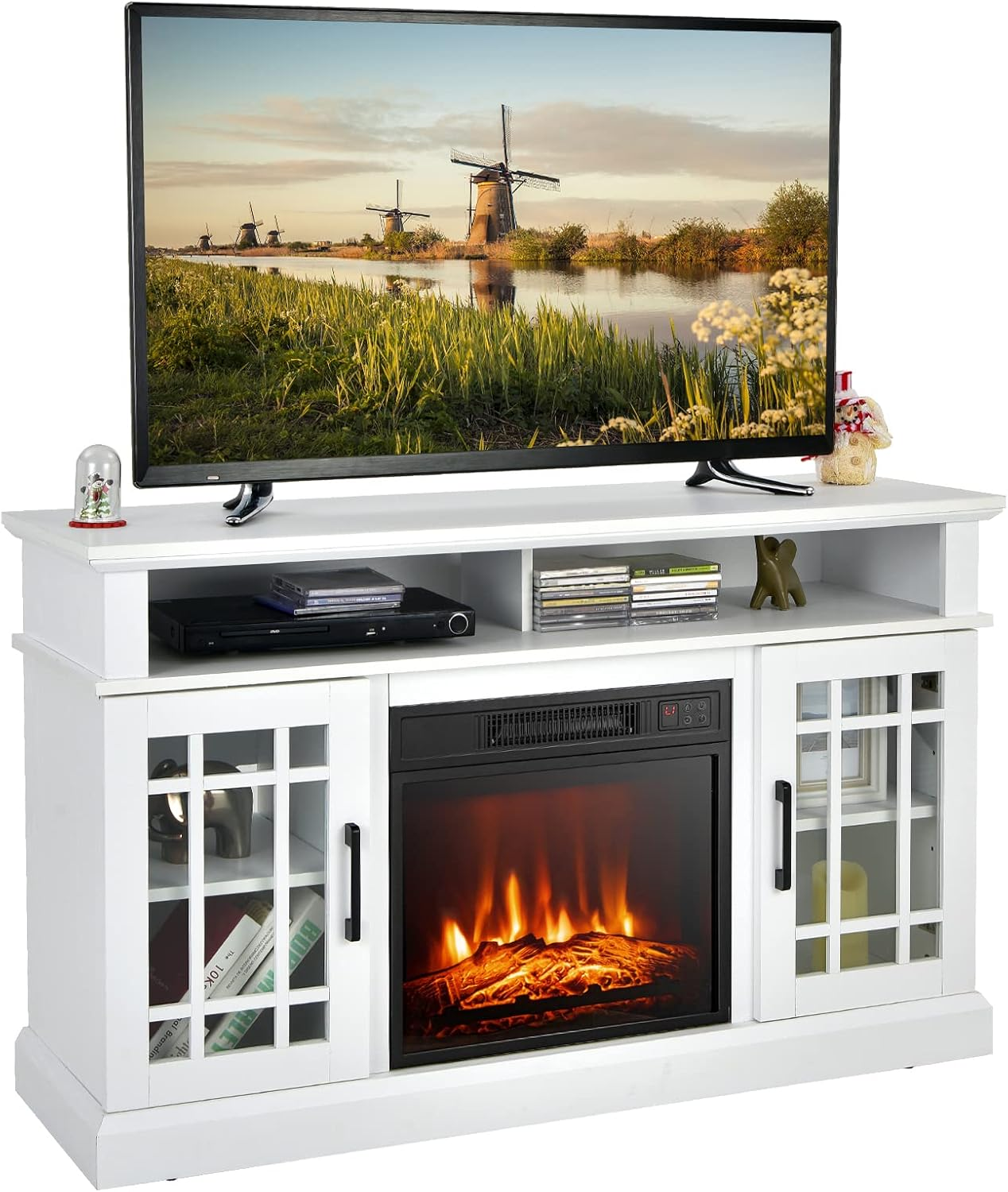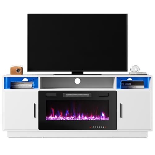 White Electric Fireplace TV Stand | Large Media Cabinet with 12 Flame& Back Colours