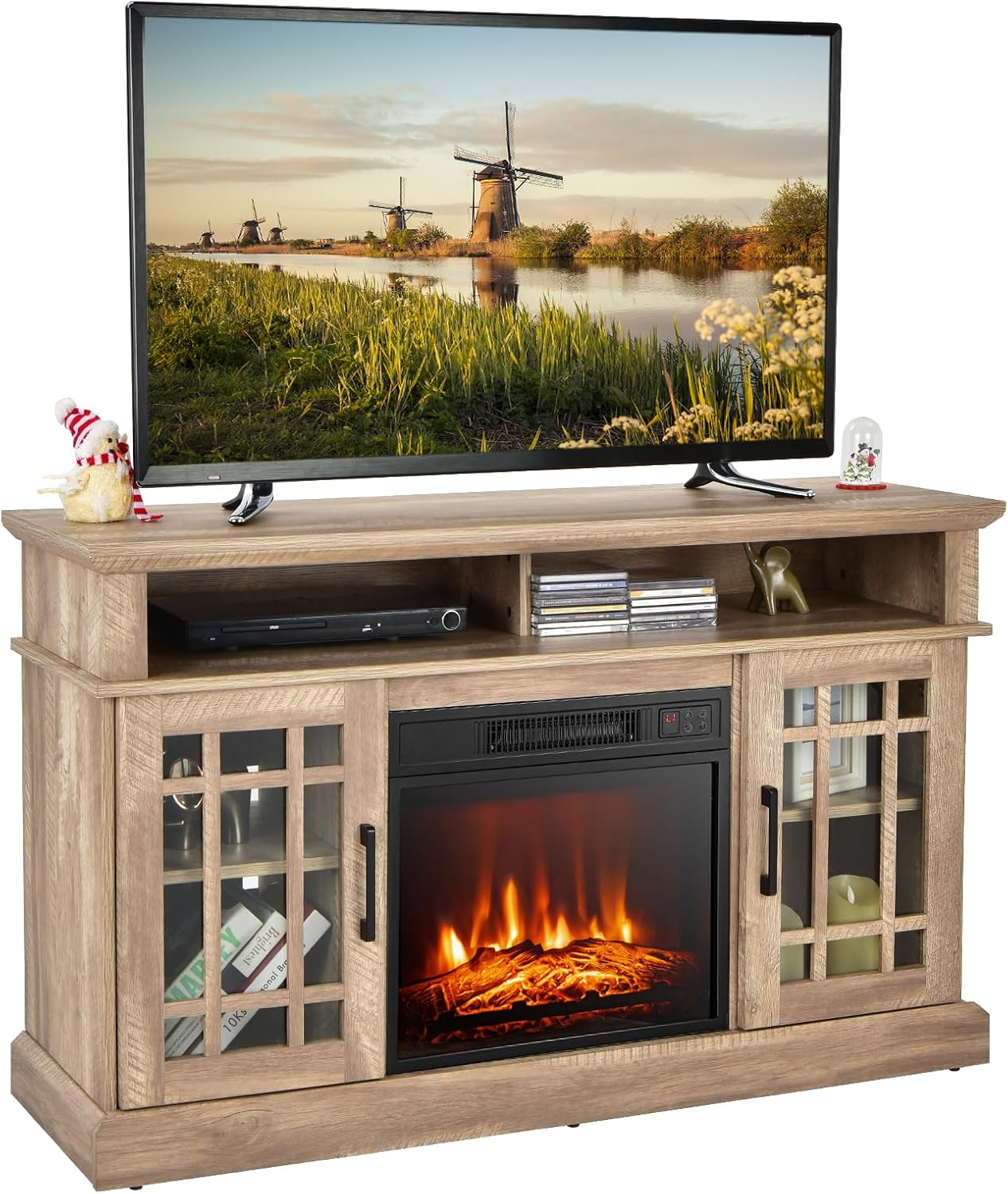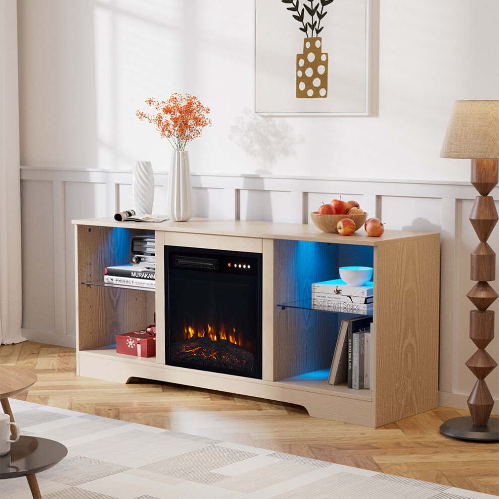 Light Wood Grain Electric Fireplace TV Stand-15 Colours LED Light String, Touchscreen-enabled& Remote-controlled
