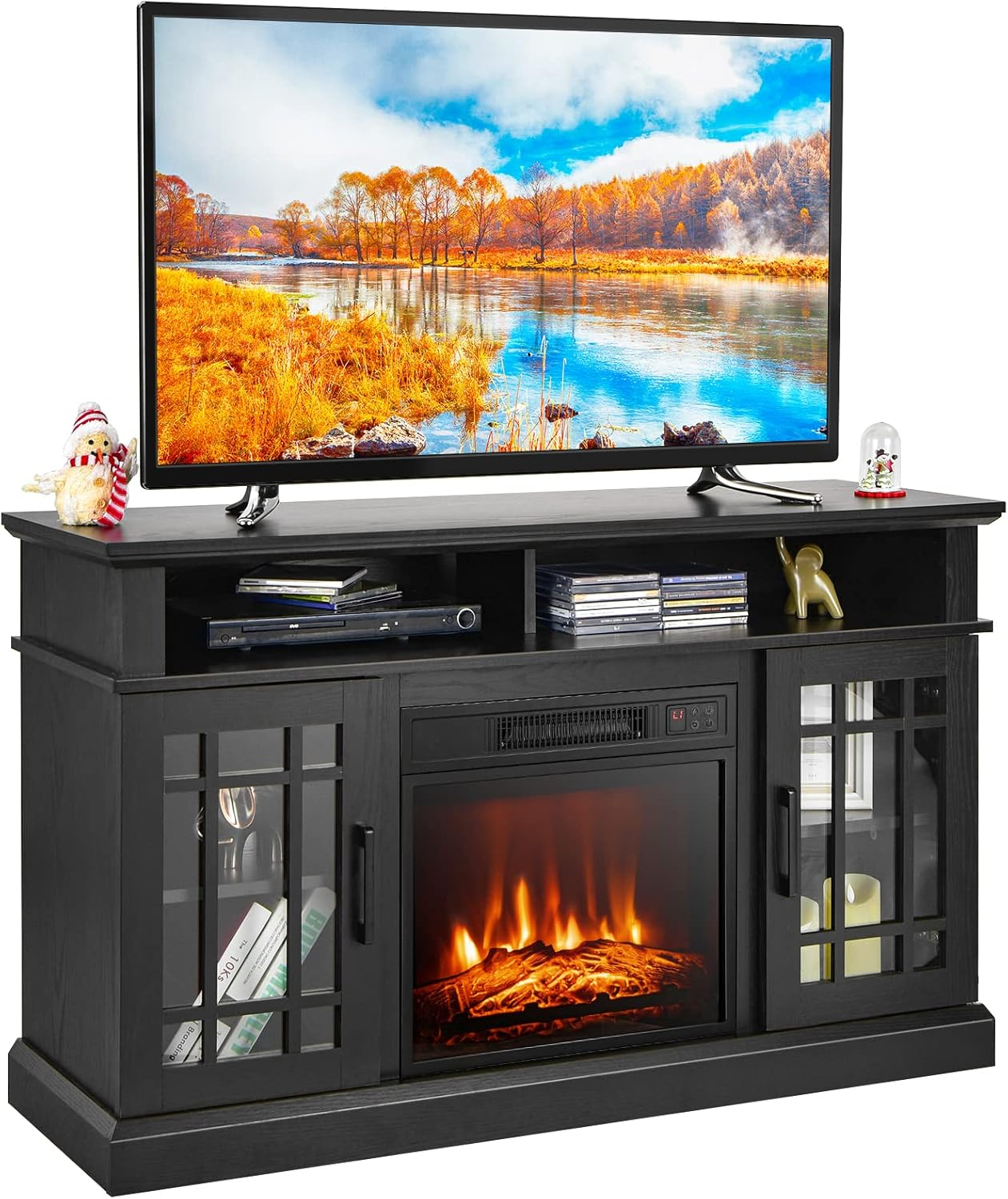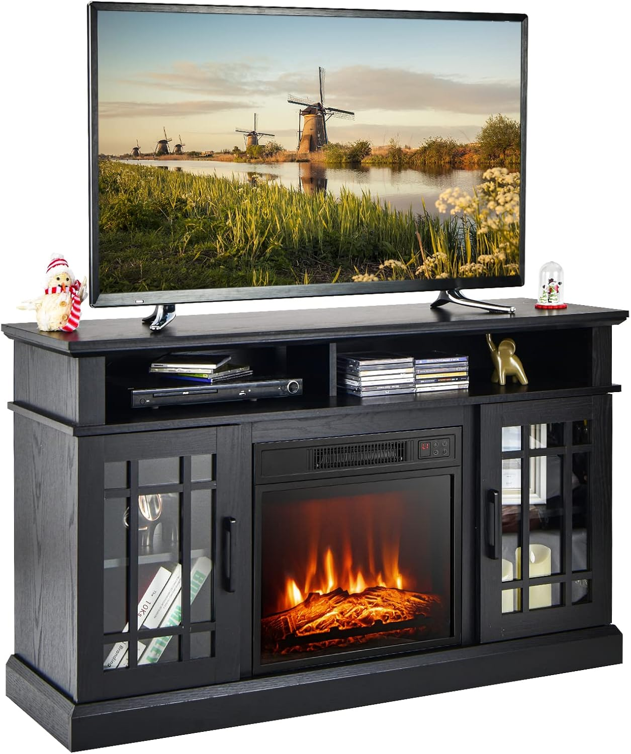 COSTWAY TV Stand for TVs up to 65 Inches, Wooden TV Cabinet Media Entertainment Center with 2 Doors & Adjustable Shelves, Living Room Bedroom TV Unit Console Table for 18" Electric Fireplace (Black)