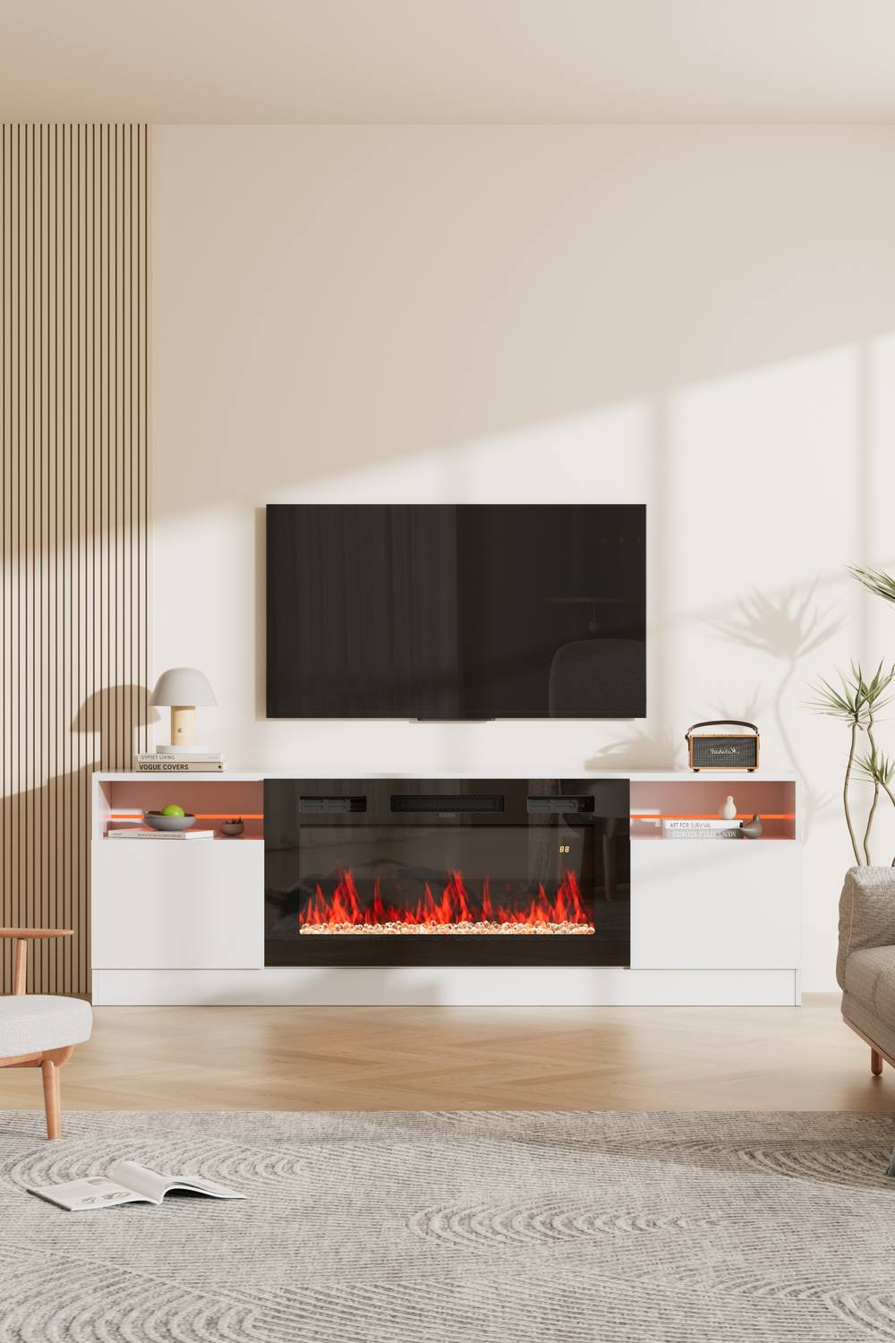 HFERTSCN Home Modern 78.7'' White Fireplace TV Stand, TV Consoles with Electric Fireplace, 3D Realistic Flame, 2 Door Storage Cabinet Decor FANDIAO