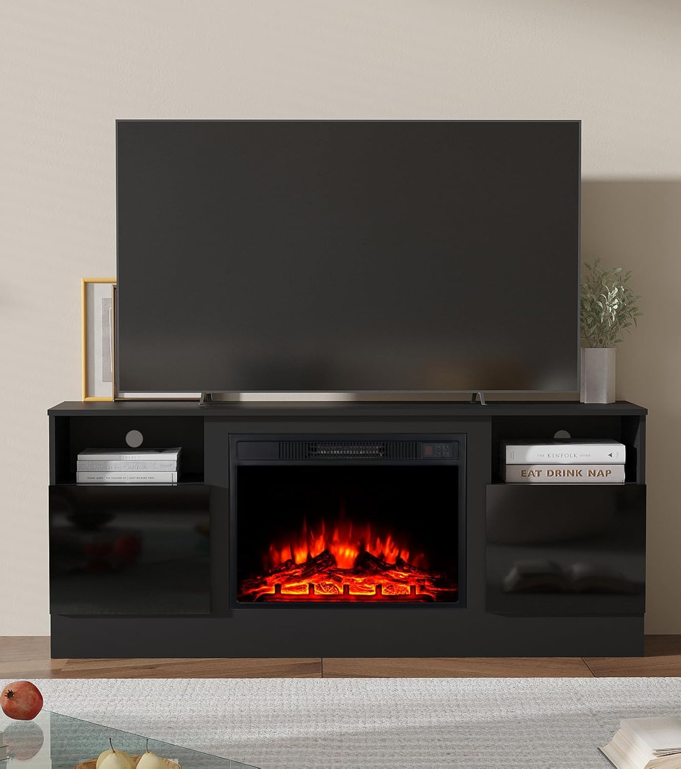 Black Electric Fireplace With TV Stand Cabinet Fire Logs Heater Flame LivingRoom