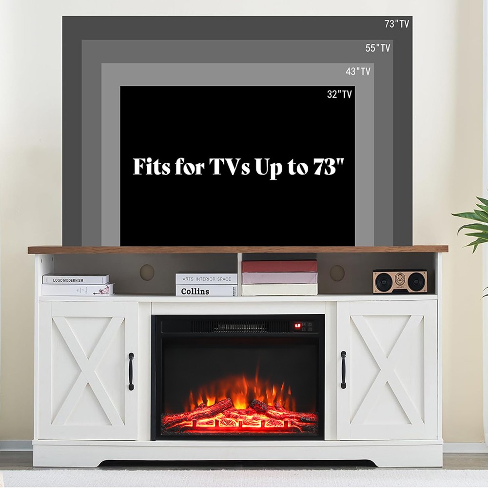 SUNVIVI Sideboard Buffet Cabinet with Sliding Barn Doors, Farmhouse TV Stand for 23" Electric Fireplace, Kitchen Storage Cupboard with Adjustable Shelves, Coffee Bar Table for Living Room (White)