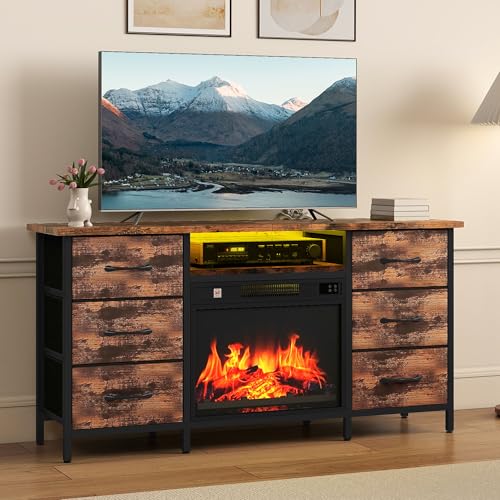 TAUS Electric Fireplace Insert TV Stand Cabinet, 6 Drawers Electric Fireplace Insert TV Unit for 55 Inch TV Entertainment Center with LED Lights, Overheat Protection 3D Realistic Flame Heater