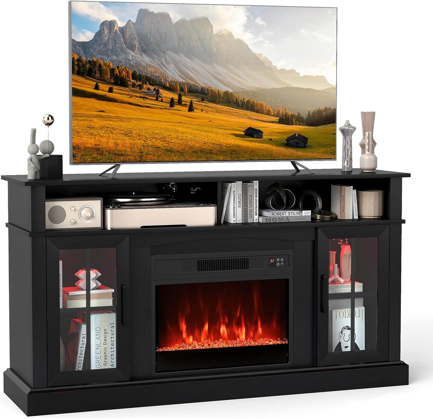 Black Electric Fireplace TV Stand | Large Media Cabinet with 12 Flame& Back Colours