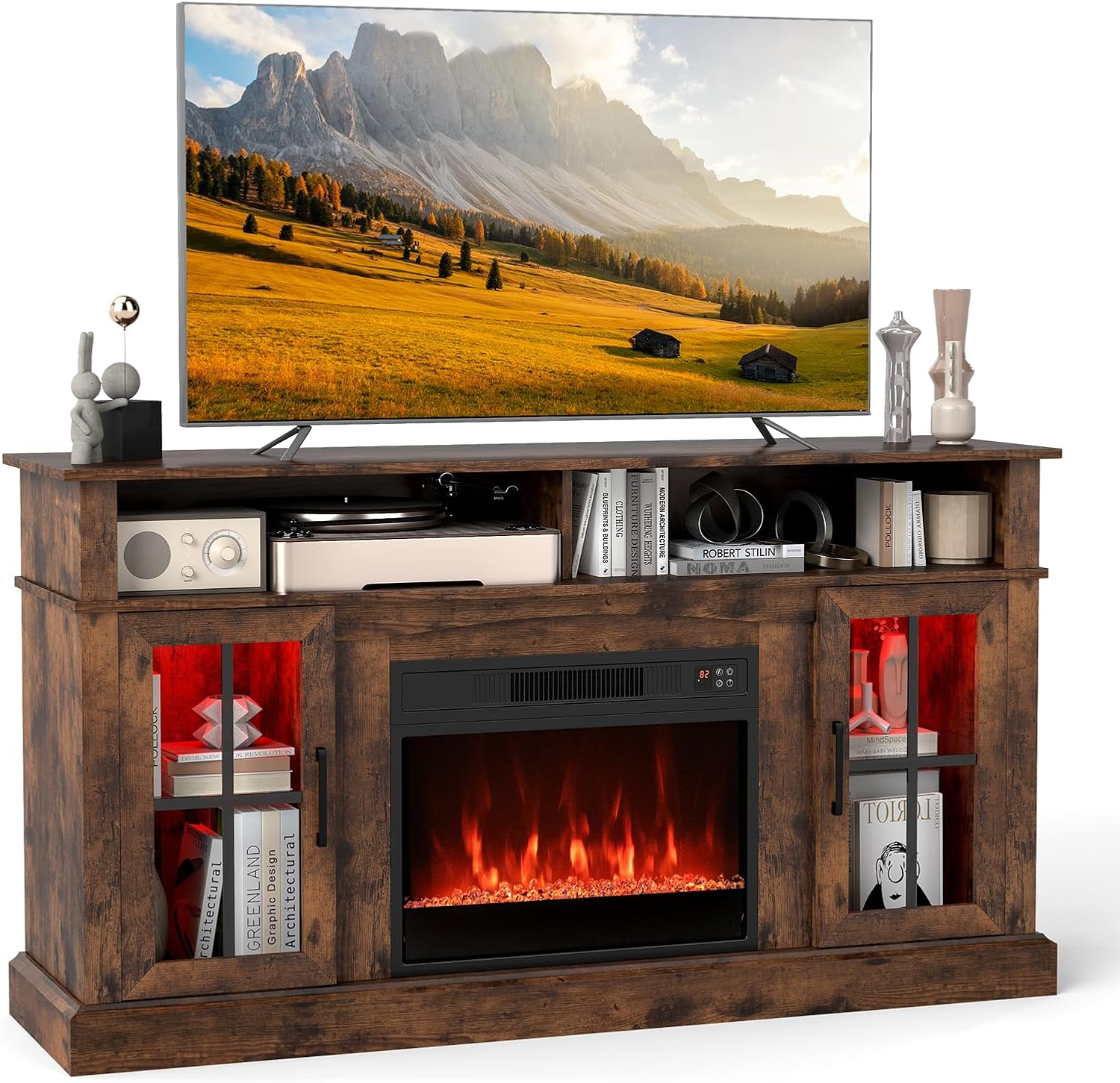 CASART TV Cabinet, Industrial Media Entertainment Center Wooden TV Stand with Shelves & 2 Doors, Living Room Bedroom Console Table Multifunctional Storage Unit for TV up to 65", 18" Electric Fireplace