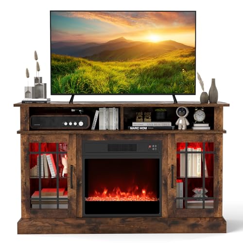 COSTWAY Electric Fireplace Insert TV Stand, Entertainment Center Console Table for 50" TVs with RGB LED Lights, Adjustable Flame, Overheat Protection Fireplace Heater & Remote Controls (Rustic Brown)