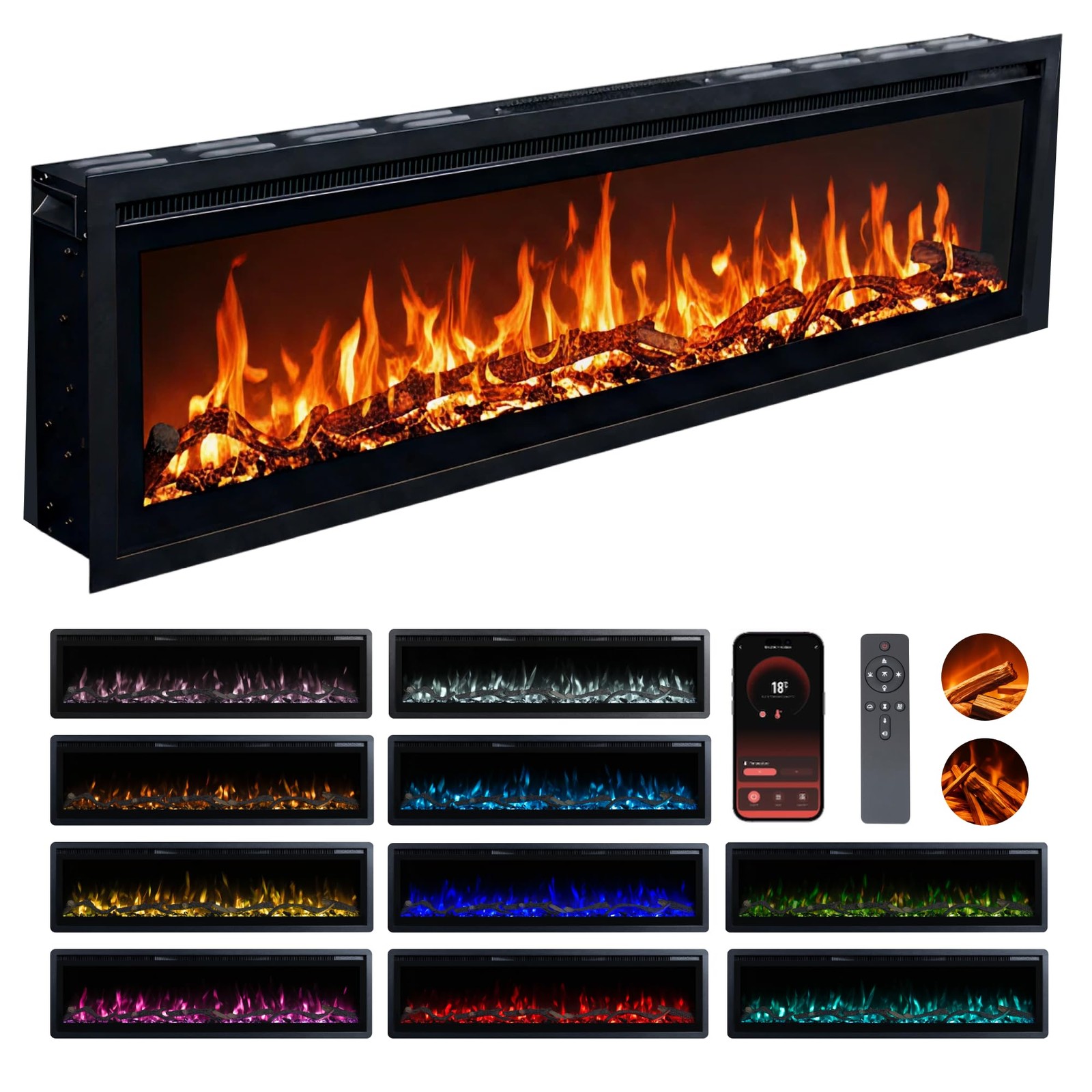 Valine Fires Recessed Electric Freestanding Fireplace UltraSlim Heater 60"/152cm, Wall-Mounted Fireplace for Media Wall, Electric Fire with 15 LED Flame Colours, Wifi/Alexa Remote Control, 900W/1800W