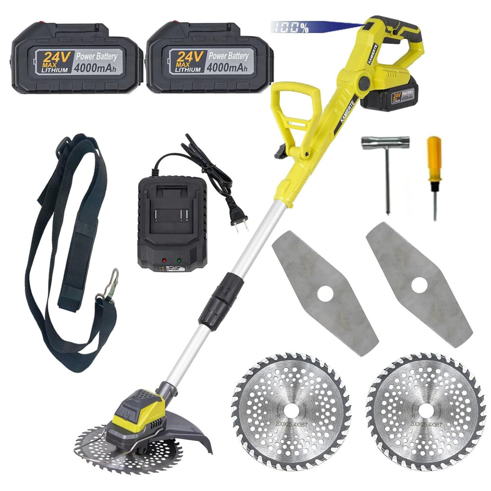 (w/ 2 Batteries) Cordless Grass Trimmer with Battery and Metal Blades Powerful Electric Strimmer Garden Grass Edger Weed Cutter Lawn Trimmer Set, Tele