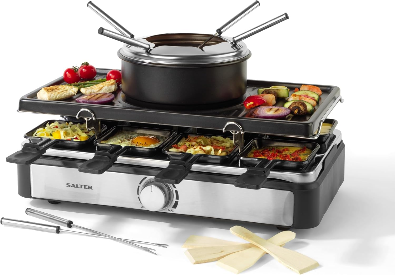 Salter EK4513 Electric 2 in 1 Raclette Grill & Fondue Set, 1400 W, 1.3 L Pot, 8 Non-Stick Pans & Wooden Spatulas, 6 Fondue Forks, Adjustable Temperature Control, Perfect for Parties and Indoor Use
