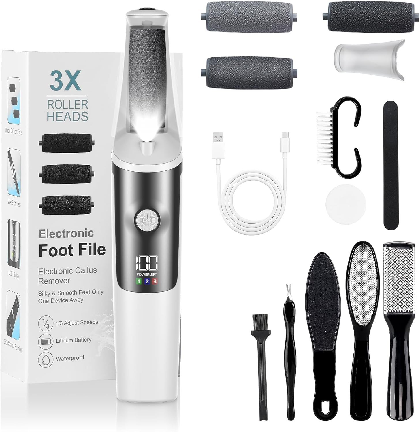 Cordless Electric Foot File, Hard Skin Remover Pedicure with 3 Rollers