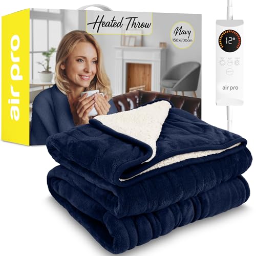 Air Pro Heated Throw - Electric Blanket - Digital Controller - Timer up to 9 hours, 6 Heat Settings, Auto Shutoff - Machine Washable - Double 150x200cm - Navy Shearling
