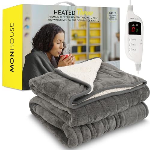MONHOUSE Heated Throw - Electric Blanket - Digital Controller - Timer up to 9 hours, 9 Heat Settings, Auto Shutoff - Machine Washable - Double 150X200cm - GREY
