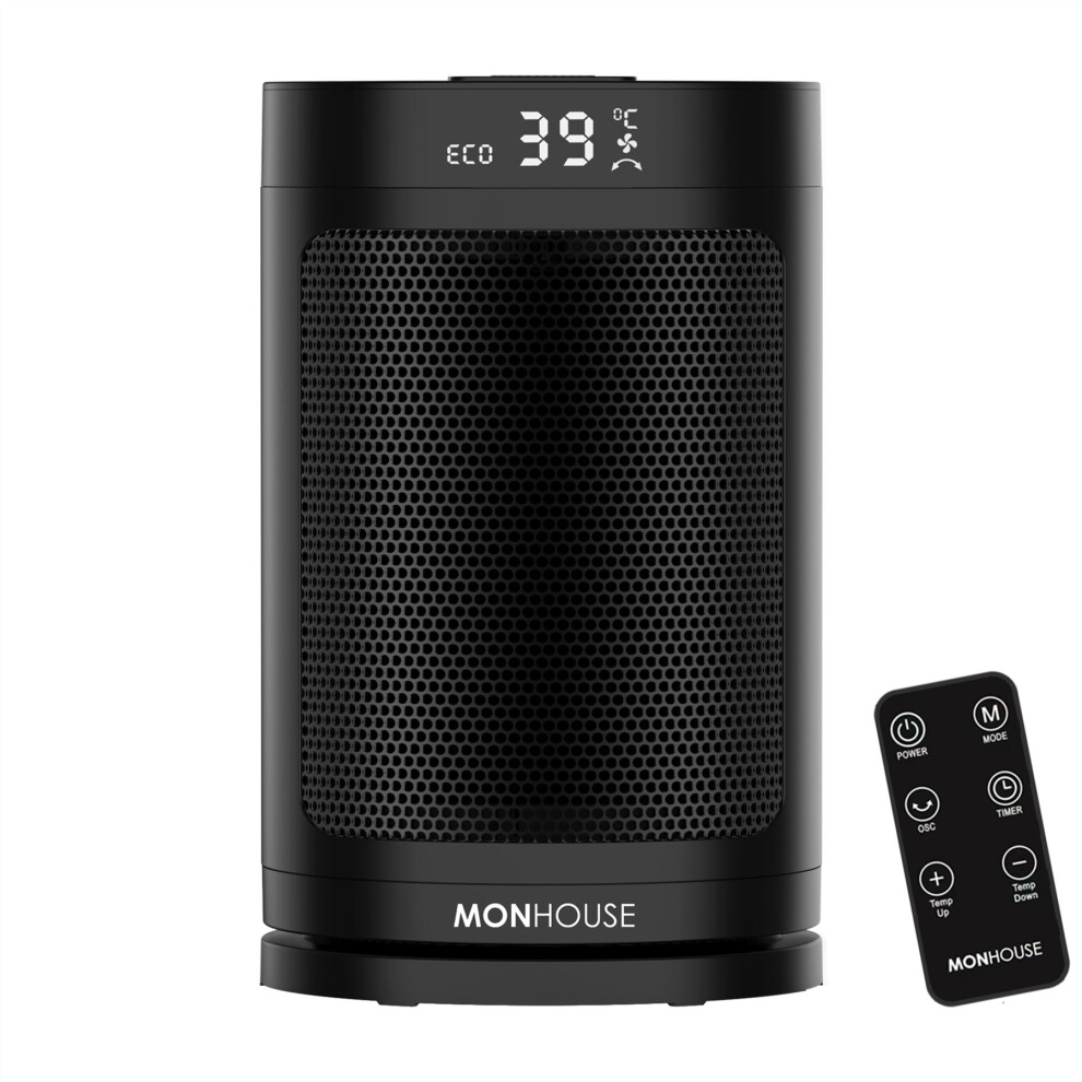 (Black, 24cm) MONHOUSE Electric Space Heater - Energy Efficient PTC Ceramic Heater - Oscillation, Remote Control & Overheat Protection, 12H Timer