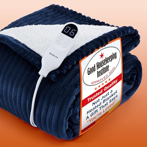 Bedsure Heated Blanket Electric Throw - Ribbed Flannel Electric Blanket, Heating with 10 Time Settings, 6 Heat Settings, Overheat Protection, 130x160cm, Striped Blue