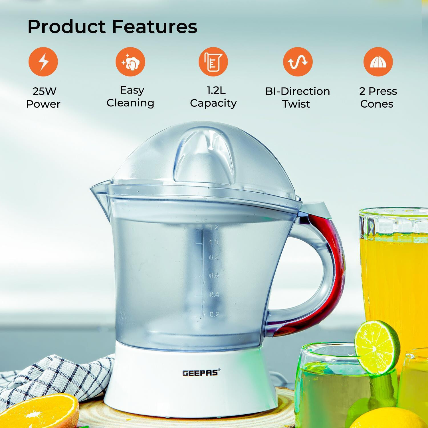 Geepas 25W Electric Citrus Juicer | Lemon Squeezer for Orange Lime Grapefruit | 1.2L Capacity Bi-Directional Twist Dual Cone Auto Start | Quick Fresh Healthy Nutritious Juice Daily | 2 Year Warranty