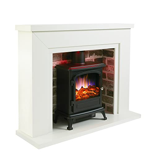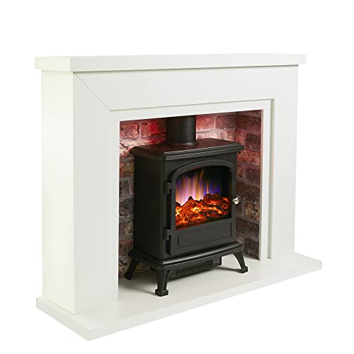Endeavour Fires Farlington Electric Fireplace, Black Log Burner Stove in 48’’ Off White Surround, LED Downlights with Remote Control (White Top/Rustic Brick)