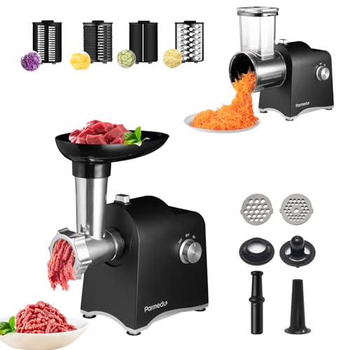 Parmedu Electric Cheese Grater & Meat Grinder: Electric Vegetable Cutter Electric Slicer Shredder Salad Maker - Professional Meat Mincer with 2 Plates, Sausage Maker & Kibbe Kit(Total 12 Attachments)