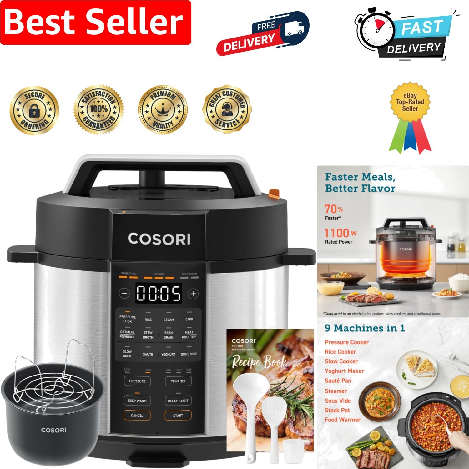 COSORI Electric Pressure Multi Cooker 5.7L, Recipe Book, 9-in-1, Steamer, Rice & Slow Cooker, Sauté Pan, Yoghurt & Cake Maker, Sous vide, Stock Pot, Food Warmer, Ceramic Non-Stick Coating