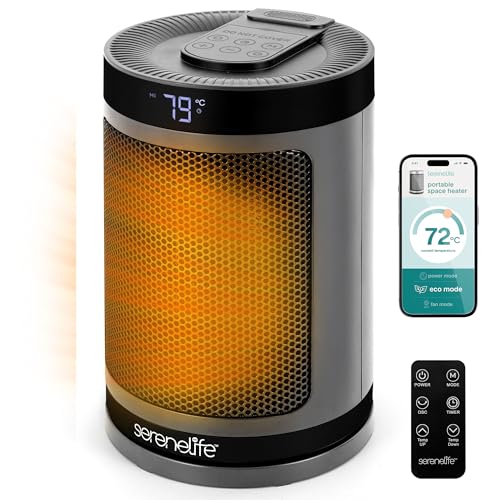SereneLife Electric Space Heater, 1500W Portable Low Energy Ceramic Fan Heater Thermostat, WiFi & Remote Control, Silent Operation, 3 Modes, 12-Hour Timer, Indoor Use, Home, Bedroom, Office (Grey)