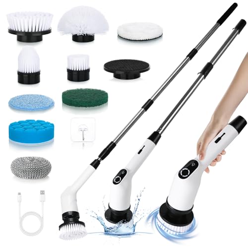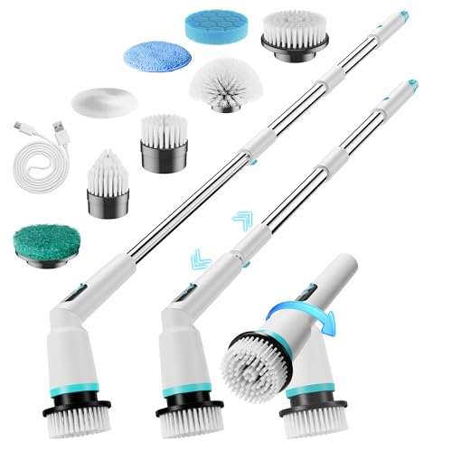 Electric Spin Scrubber,Cordless Electric Cleaning Brush,Shower Scrubber 2 Speeds,8 Brush Heads,IPX7 Waterproof,Adjustable Long Handle for Bathroom, Tub,Tile,and Car