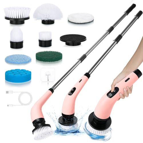 PKBD Electric Spin Scrubber, 2025 Upgrade Waterproof Cordless Electric Cleaning Brush with 8 Replaceable Heads, Digital Display, Three Clean Speeds, Retractable Handle, for Bathtub, Tile, Floor
