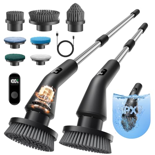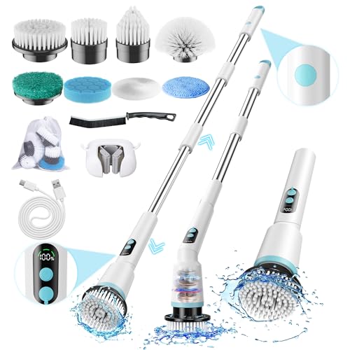 Electric Cleaning Brush, Electric Spin Scrubber with Long Handle, IPX7 Bathroom Cleaning Brush with LED Display, Bathroom Scrubber with 2 Spin Speeds, 7 Brush Heads for Shower, Tub, Kitchen