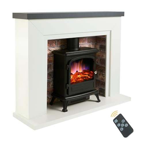 Endeavour Fires Farlington Electric Fireplace, Black Log Burner Stove in 48’’ Off White Surround, LED Downlights with Remote Control (Grey Top/Rustic Brick)
