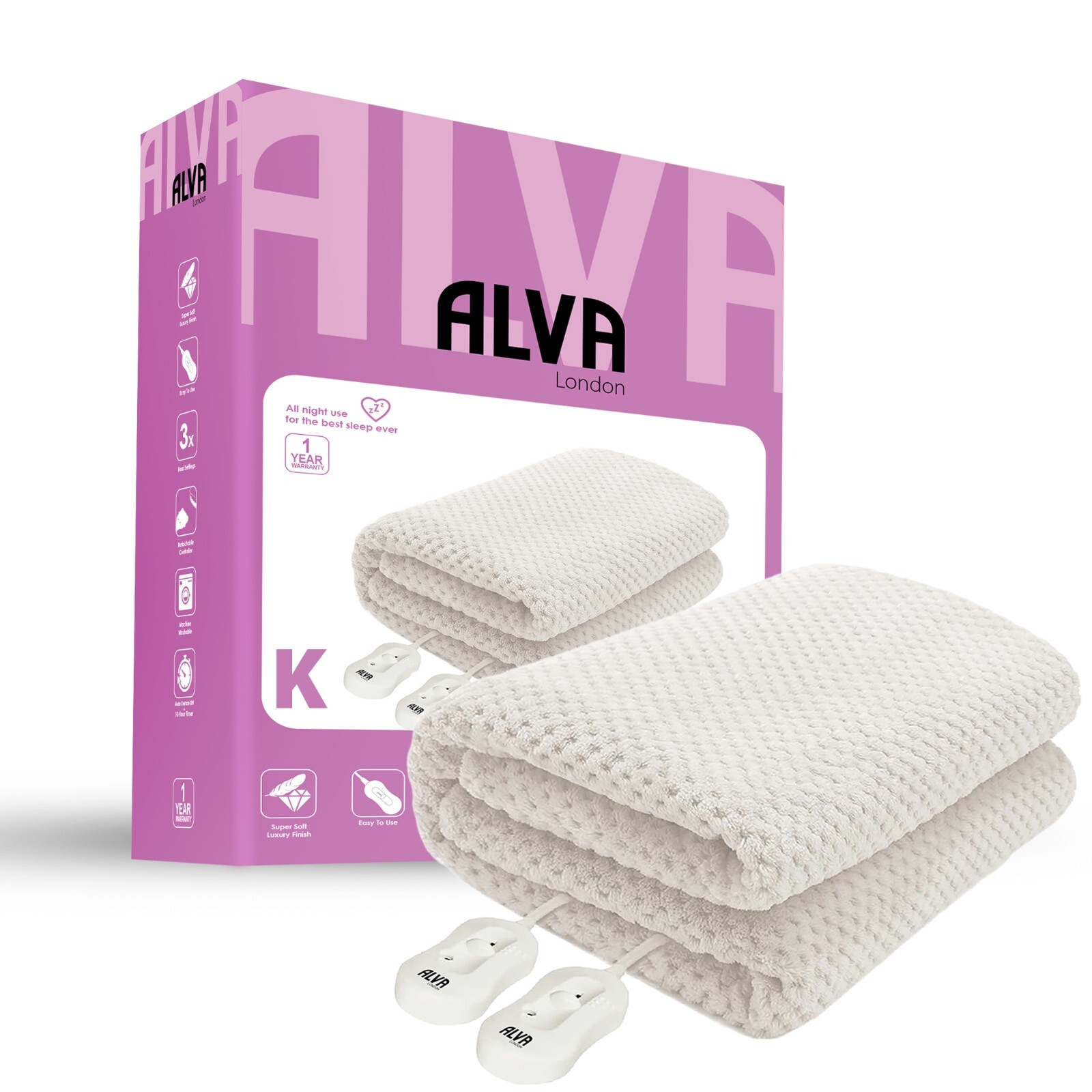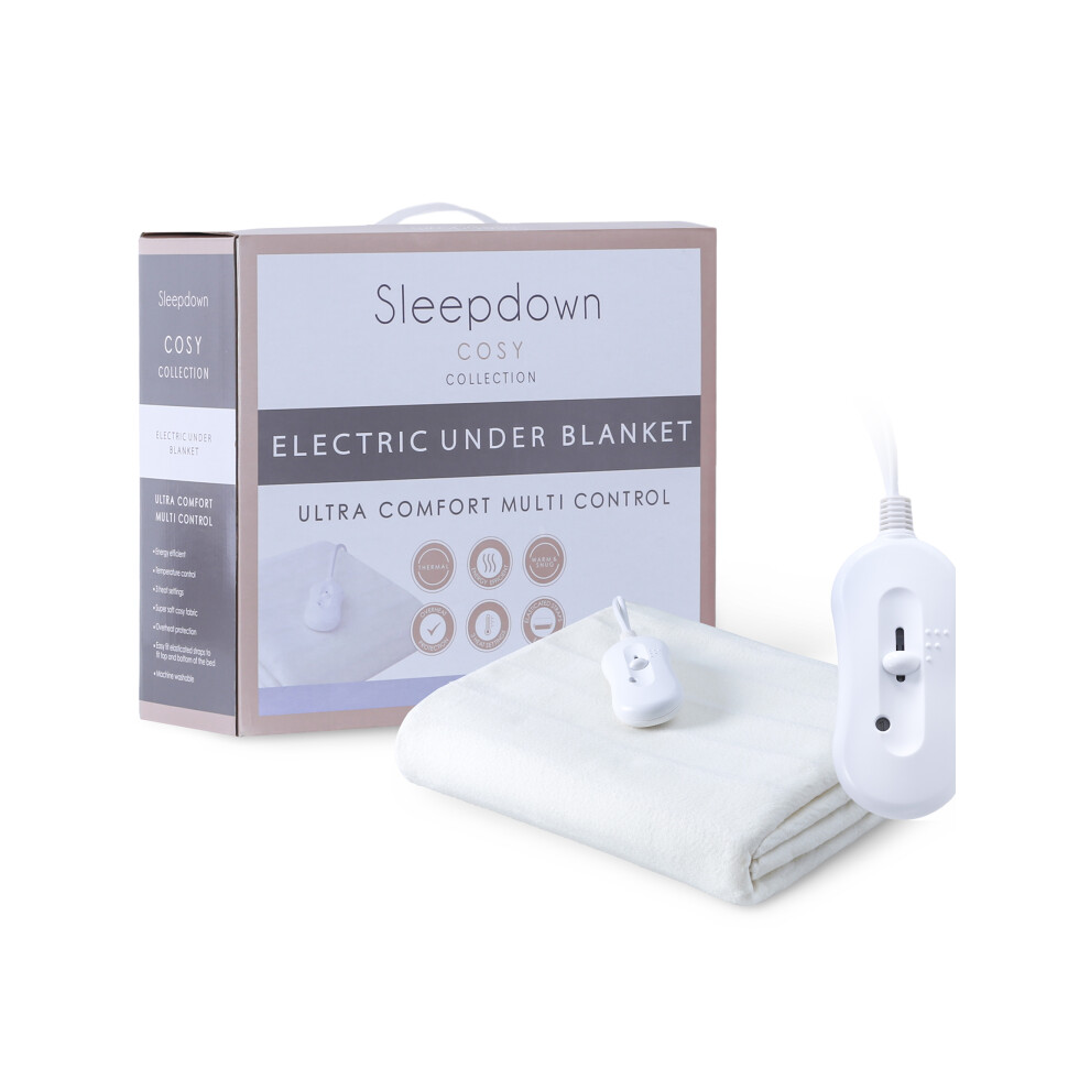 Electric Blanket Heated KING Under Bed Comfort Detachable Controller with 3 Heat Settings, Polyester, White Super Cosy Washable Fleece Heated Throws